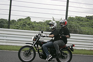 各ライダーは身障者の方にコースの説明やレースの話をしながら、コースを走ります。メインスタンドに通りか掛かった頃には場内アナウンスで風の会の紹介がされ、参加ライダー・参加予定ライダーの名前が伝えられます。
