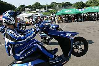 今年は、恒例となった、スクーターウィリーデモチームのTRIAL eXchange 風の会W1チームの演技が披露され、昨年以上に凝った趣向で会場を湧かせて頂きました。