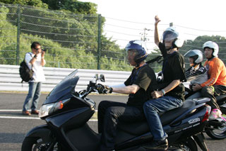 本年はライダーも、元HRCの副社長も参加頂くという豪華メンバーでのライディングとなりました。18:00前、コ-ス上に移動し、整列後スタート。サーキットコースを1周し、無事戻ってきました。特に今年は、昨年以上に熱い中での乗車で、ライダーも身障者の方も大変だったと思いますが、鈴鹿サーキットのコースをバイクで駆け抜ける時に感じる「風」がとても心地よかったのではないかと思います。
