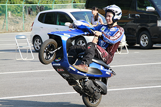 次に恒例となった、スクーターウィリーデモチームのTRIAL eXchange 風の会W1チームの演技が披露され会場を湧かせてました。今年は新メンバーのお披露目もあり、迫力あるステージで会場は盛り上がります!