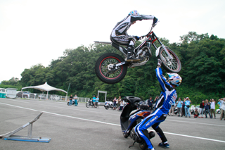 次に恒例となった、スクーターウィリーデモチームのTRIAL eXchange 風の会W1チームの演技が披露され会場を湧かせてました。今年はトライアルバイクでの演技も披露され、迫力あるステージで会場は盛り上がります!