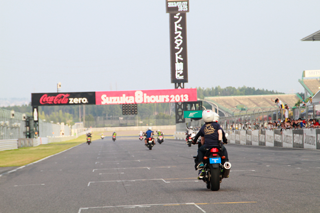 各ライダーは身障者の方にコースの説明やレースの話をしながら、コースを走ります。メインスタンドに通りか掛かった頃には場内アナウンスで風の会の紹介がされました。それに応じて、参加しているライダーのチーム関係者が、メインスタンドからは風の会の紹介アナウンスが流れ、観客の方が手を振って声援してくれます。メインスタンドの観客の方々やピットロードからチーム関係者も、精一杯手をふってくださってます。