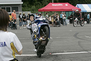 今年は、恒例となった、スクーターウィリーデモチームのTRIAL eXchange 風の会W1チームの演技が披露され、昨年以上に凝った趣向で会場を湧かせて頂きました。