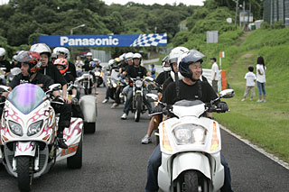 各ライダーは身障者の方にコースの説明やレースの話をしながら、コースを走ります。メインスタンドに通りか掛かった頃には場内アナウンスで風の会の紹介がされ、参加ライダー・参加予定ライダーの名前が伝えられます。